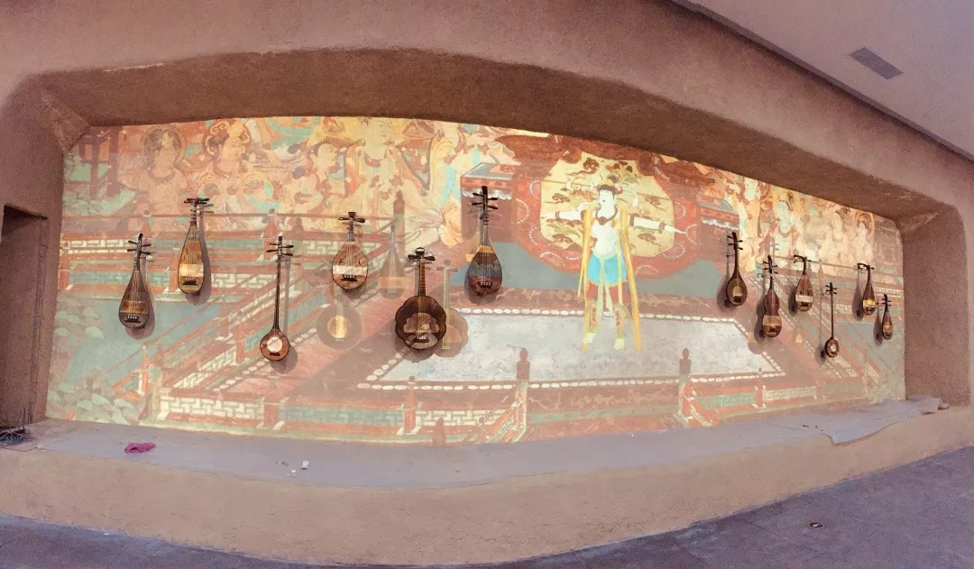 踏進“敦煌樂舞”按照敦煌壁畫原景高度還原的影像投射墻步入眼簾,敦煌特色民族樂器被錯落有致地安排在了墻面兩邊,飛天神女做反彈琵琶的身形,其神態(tài)雍容、身姿綽約地穿梭與樂器中,兩者虛實相合、相互映襯。
