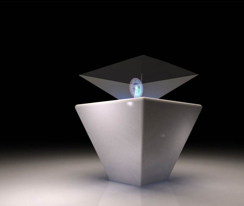 360度幻影成像系統將拍攝的影像通過成像顯示器成像,由透明材料制成的四面錐體,能從任何一面看到自由飄浮的影像和圖形。四個視頻發射器將光信號發射到這個錐體中的特殊棱鏡上,匯集到一起后形成具有真實維度空間的立體影像。