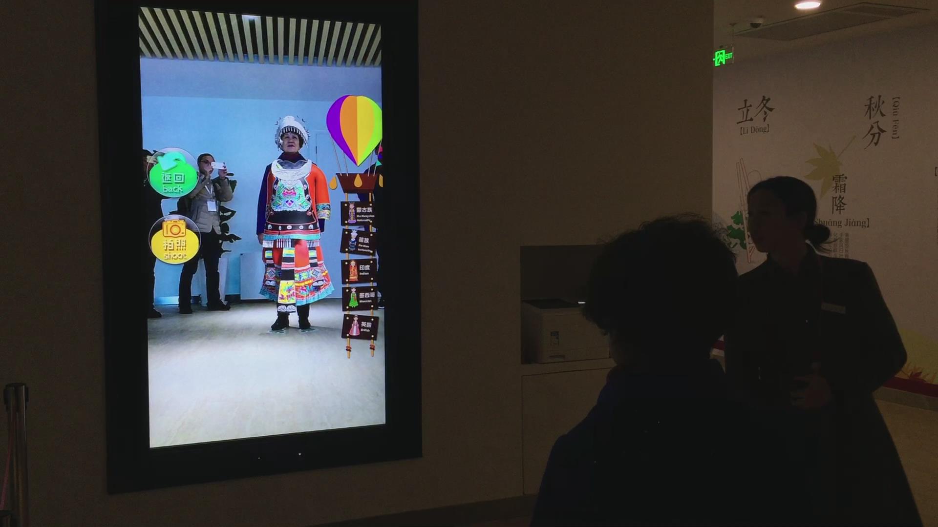 大屏虛擬換衣包含大屏顯示器,平板終端以及攝像機(jī)三塊構(gòu)成通常作為鏡子使用的大顯示器上,客戶可根據(jù)自己喜歡的樣式點(diǎn)擊想要的衣服,然后利用擴(kuò)增現(xiàn)實(shí)技術(shù)把衣服穿在身上的效果顯示出來。而此時(shí),在另一頭的電視屏幕上,會(huì)出現(xiàn)你親手搭配的即時(shí)畫面,所選單品的信息也會(huì)自動(dòng)顯示在屏幕左下角。如若不滿意,可Restart重新選擇單品更換搭配。
