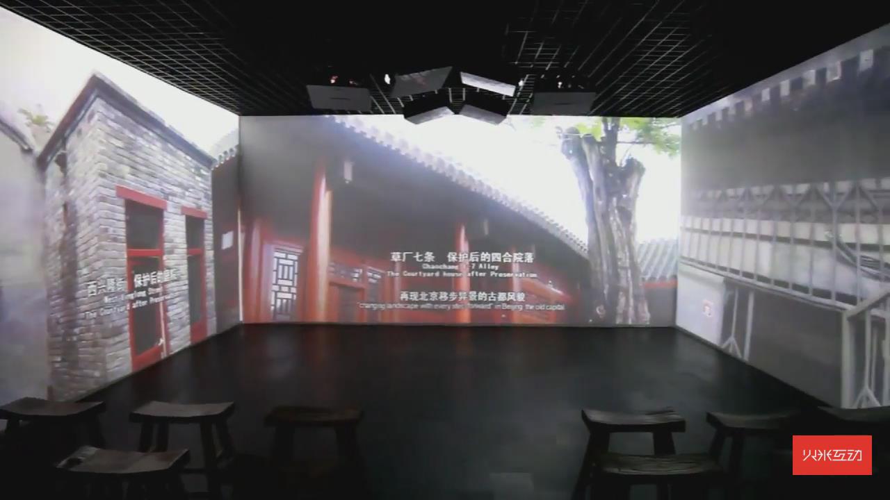 通過沉浸式三折幕投影展示了北京四合院的古都風(fēng)貌,再配上立體聲效,能夠有強力的視聽沖擊感。