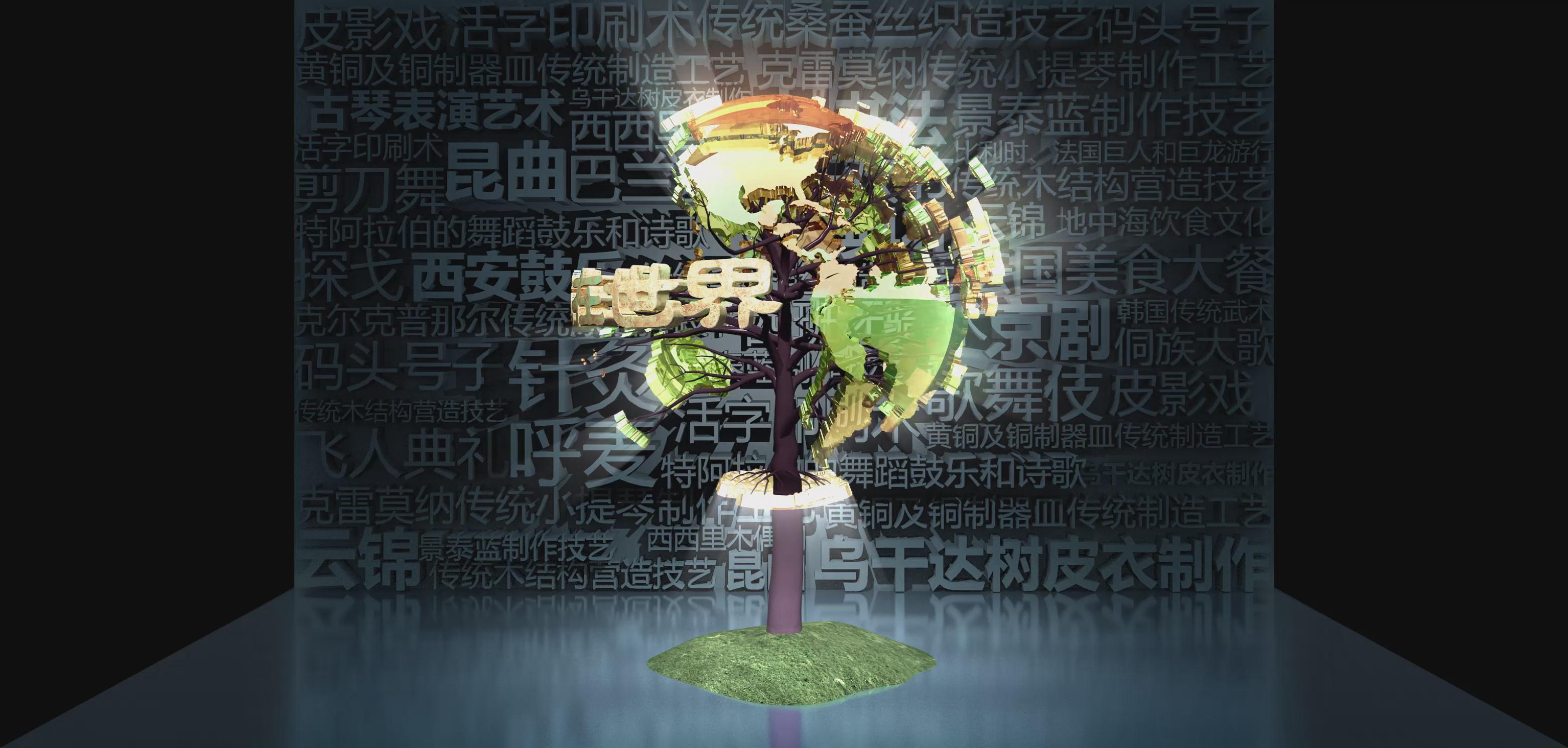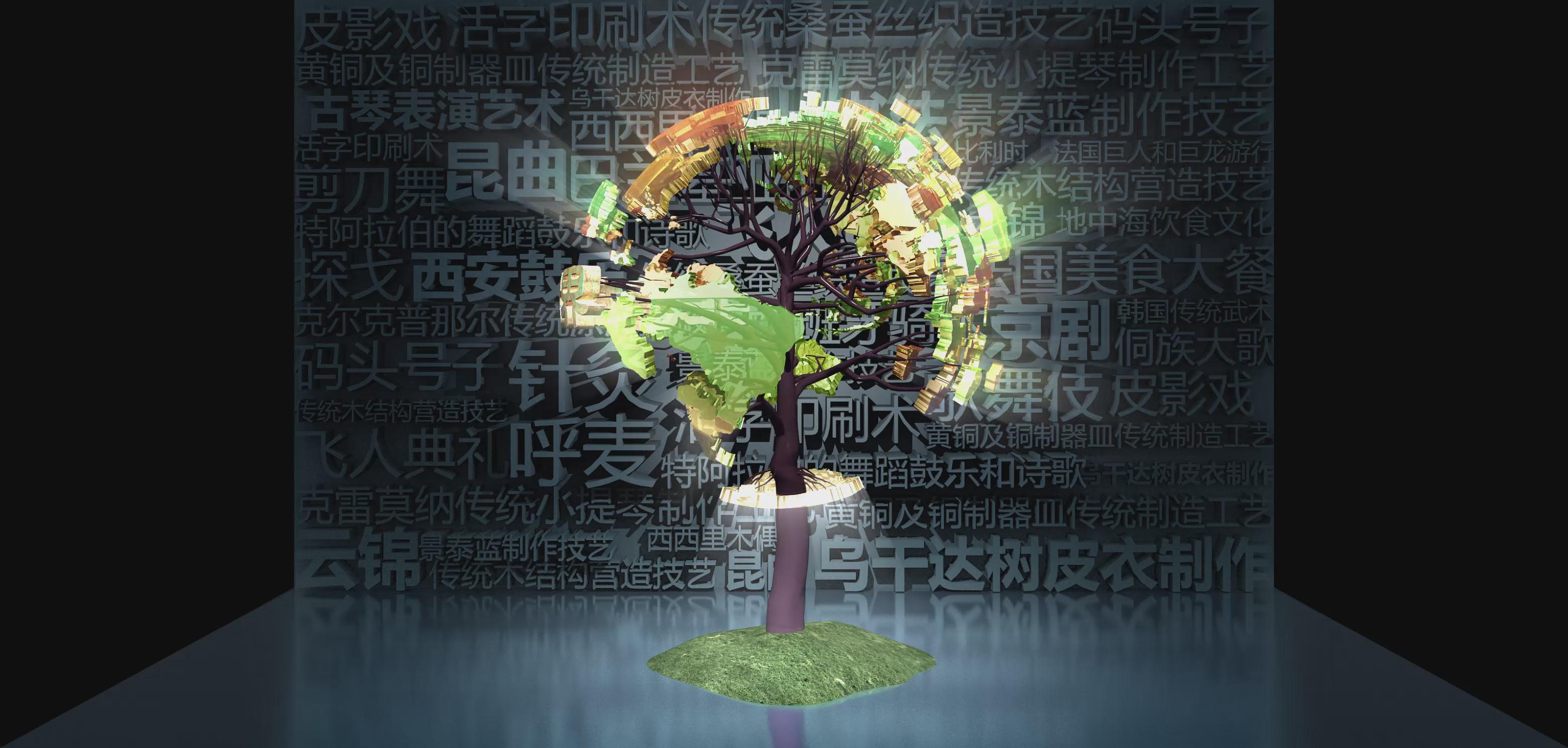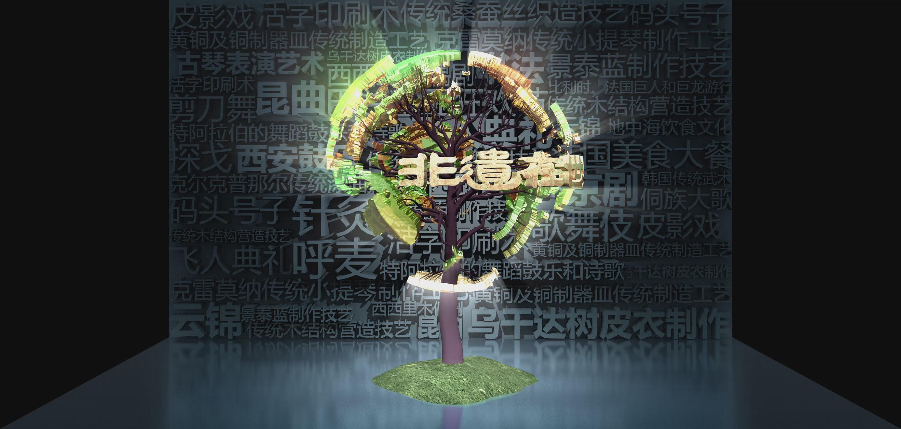 截止2017年6月,中國(guó)已有39個(gè)項(xiàng)目躋身世界級(jí)非物質(zhì)文化遺產(chǎn),項(xiàng)目總數(shù)位居世界第一。其中,人類非物質(zhì)文化遺產(chǎn)代表作名錄31項(xiàng),急需保護(hù)的非物質(zhì)文化遺產(chǎn)名錄7項(xiàng),非物質(zhì)文化遺產(chǎn)優(yōu)秀實(shí)踐名冊(cè)1項(xiàng)。 以折幕形式向大眾展示世界非物質(zhì)文化遺產(chǎn),在背景圖中列出了多種非遺事項(xiàng),結(jié)合立體模板大樹的形式,讓大家可以了解中國(guó)的非遺項(xiàng)目。